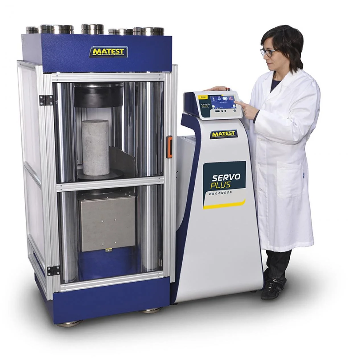 Equipo automático con capacidad de 2000 kN para ensayos en bloques, cubos y cilindros de concreto. Control Servo-Plus. Precisión y versatilidad dimensional.